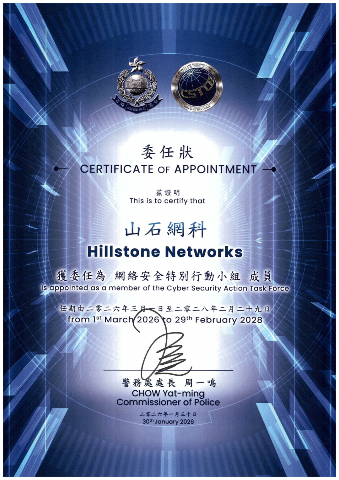 获香港警务处委任为网络安全特别行动小组成员
