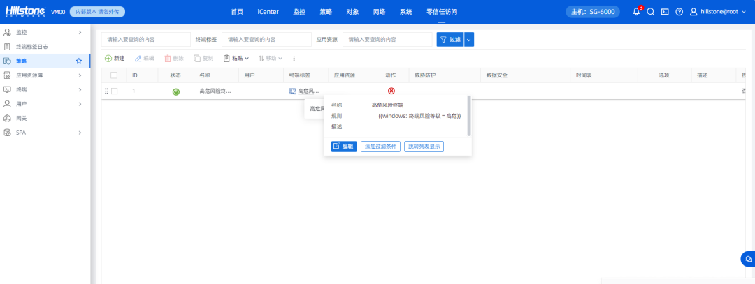 图注:防火墙基于 ZTNA 同步的高危标签,可对风险终端执行限流或阻断等操作
