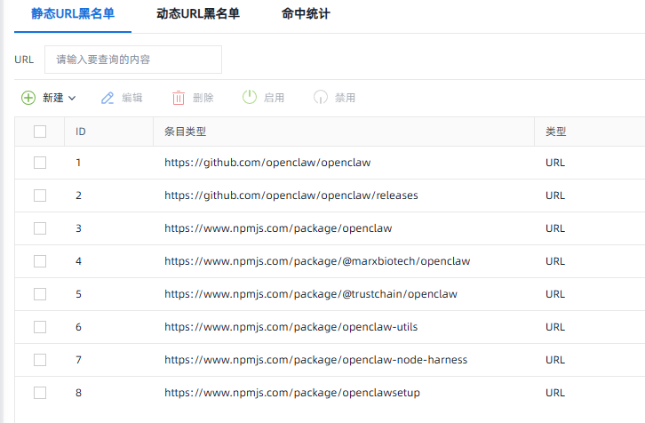 图注:静态URL黑名单配置,防止通过未授权域名下载openclaw