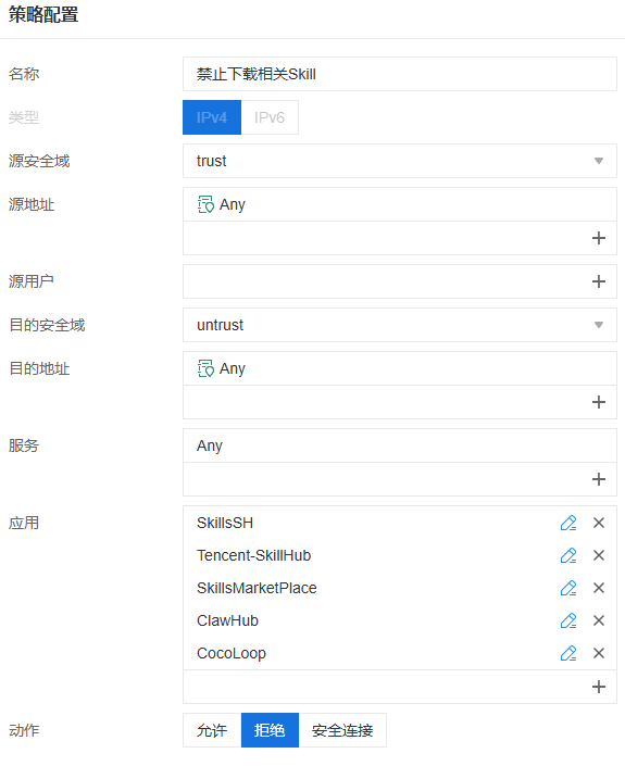 ? 插件供应链管控:针对 Skill 插件下载地址配置精细化放行/阻断策略,仅允许经审核的可信来源,规避供应链投毒风险。