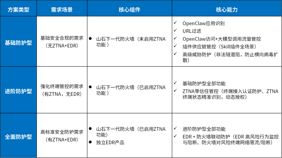 山石网科推出以下一代防火墙为核心的 OpenClaw Agent 全生命周期边界防护方案,按准备、配置、执行三阶段筑牢从源头、下载到运行的全流程安全边界防线,同时针对企业不同安全组件部署情况,提供基础、进阶、全面三类适配方案,实现风险精准管控与防护灵活选型,平衡 AI 智能体安全管控与业务合规应用。
