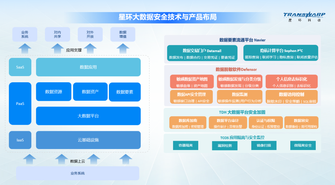 在数据平台层,星环科技大数据基础平台 TDH 在新版本上做了大量的安全加固,一个是引入了微隔离安全技术,第二个是数据库支持行列级权限控制、动态脱敏等新能力,优化了数据透明加密并支持了用国密的算法,第三是增强了数据审计能力。