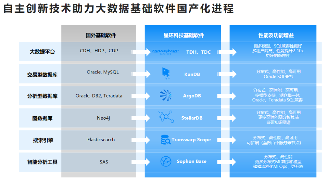 星环科技产品自带信创基因,根据工信部电子第五研究所代码扫描测试报告,星环科技大数据基础平台TDH 的1200万行代码里自研代码率超过70%,ArgoDB代码自主率(行数)分别超过90%。而且星环科技还拥有成熟的基础软件替代解决方案:
