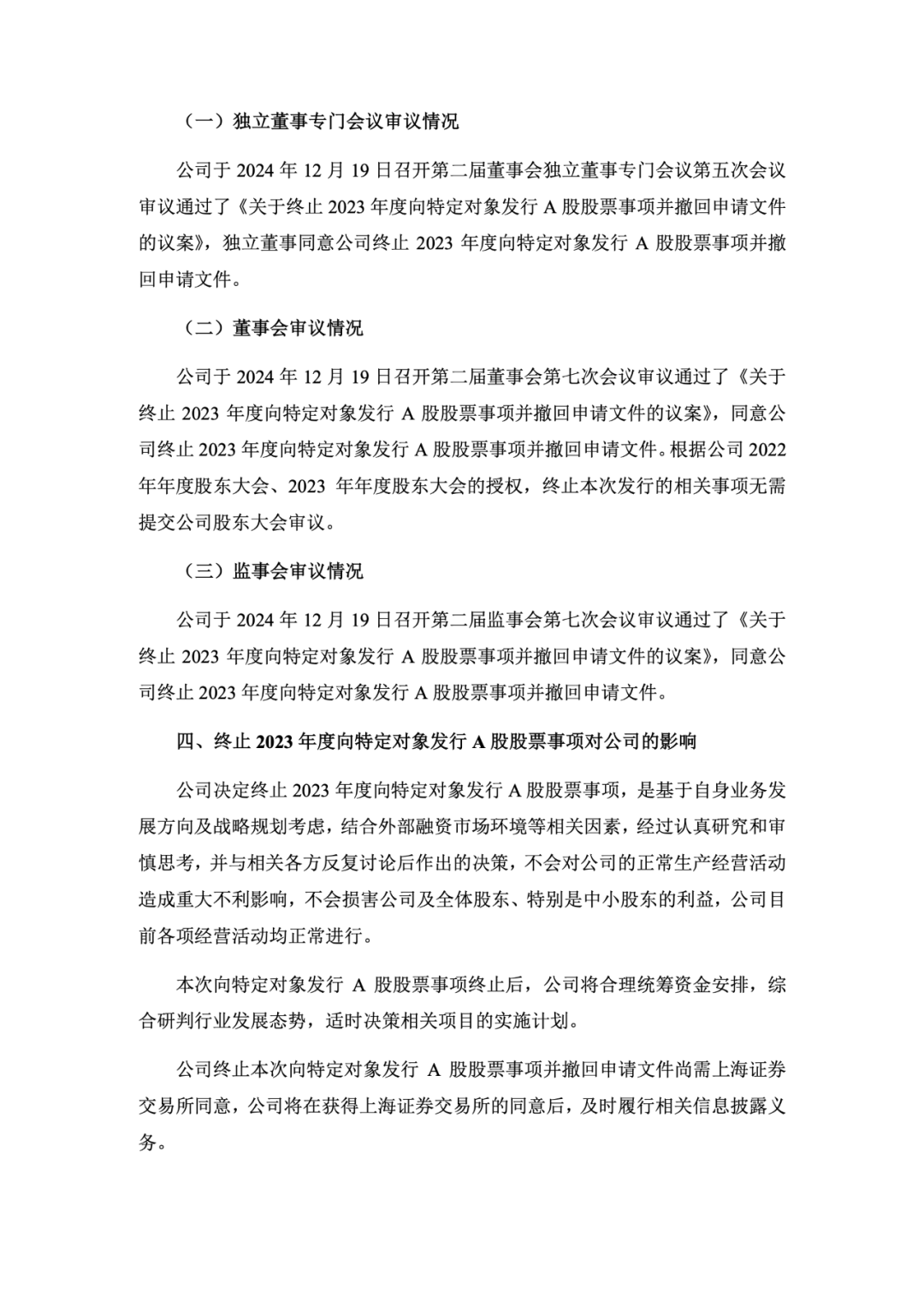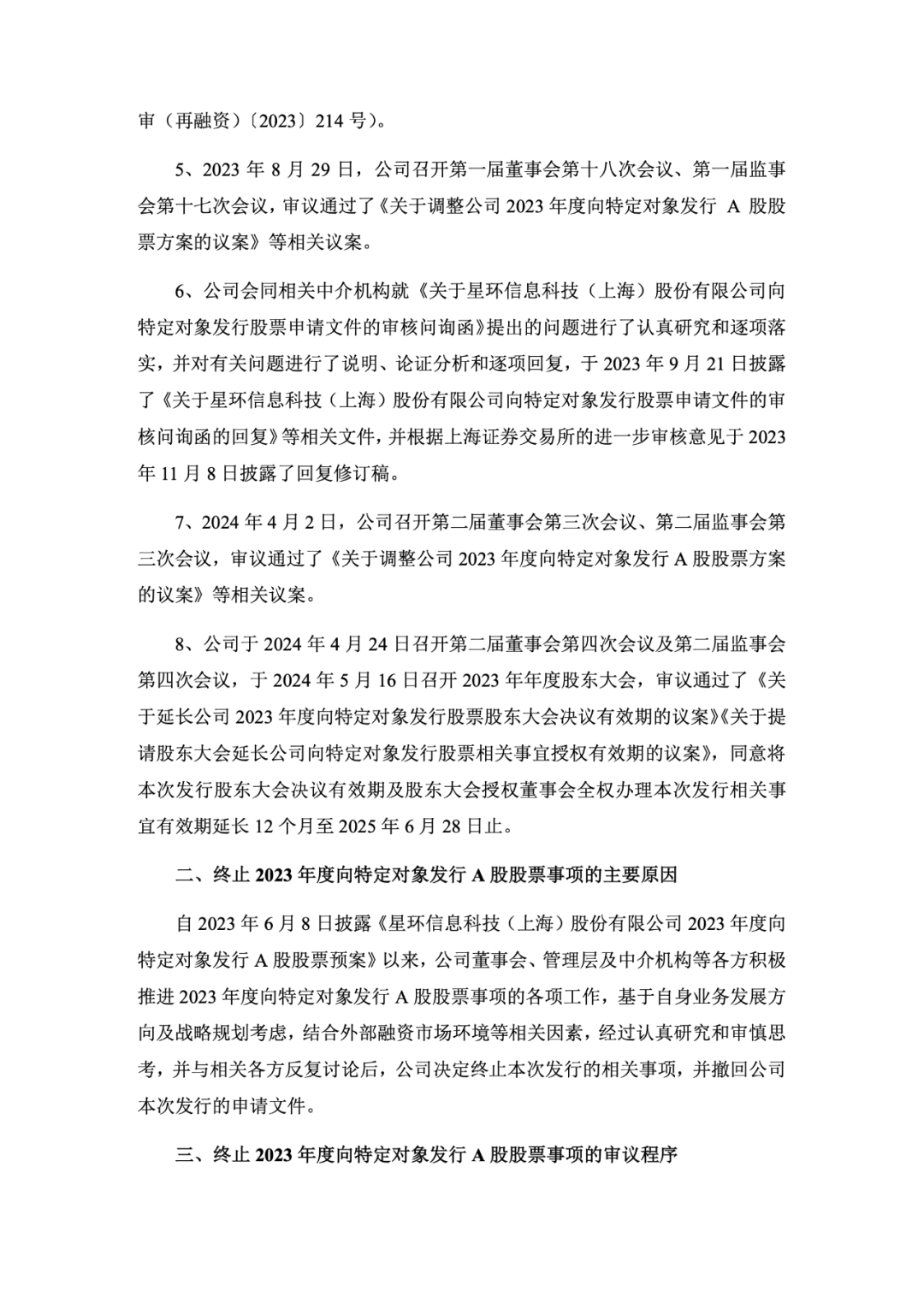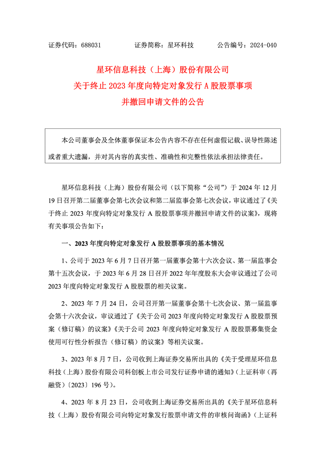 2024 年 12 月 19 日,星环信息科技(上海)股份有限公司发布《关于终止2023 年度向特定对象发行 A 股股票事项并撤回申请文件的公告》。