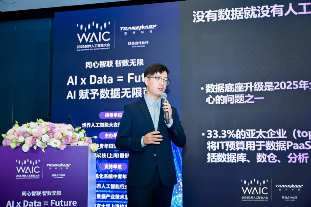 IDC中国高级分析师李浩然在演讲中,从市场分析角度有力印证了星环科技的前瞻判断。他分享的《从数据工程化来看AI-Ready数据架构建设》主题中指出没有数据就没有人工智能,根据IDC调研数据显示,数据底座升级是2025年企业最关心的问题之一,33.3%的亚太企业表示将IT预算用于数据PaaS投资,包括数据库、数仓、分析。