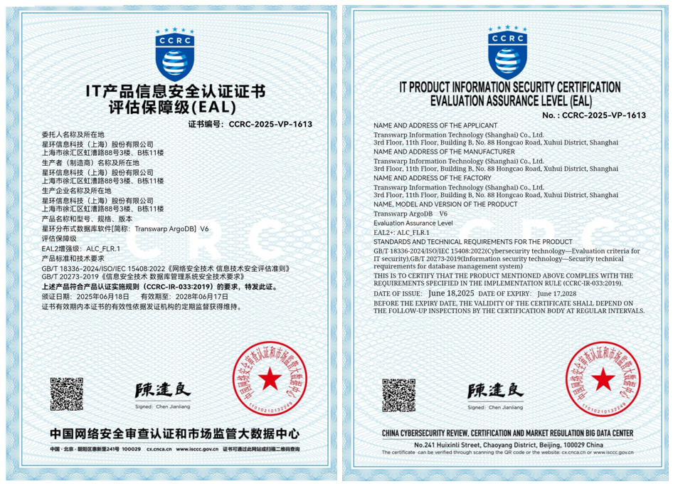 近日,星环科技分布式数据库软件Transwarp ArgoDB获得全球权威信息技术安全性评估通用标准CC EAL2级别认证。标志着星环科技分布式数据库在功能性、结构性、安全性、配置管理性等方面达到了新的高度,为用户提供了更加可靠的数据处理和管理平台。