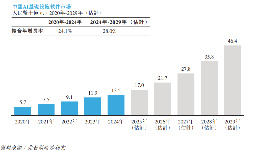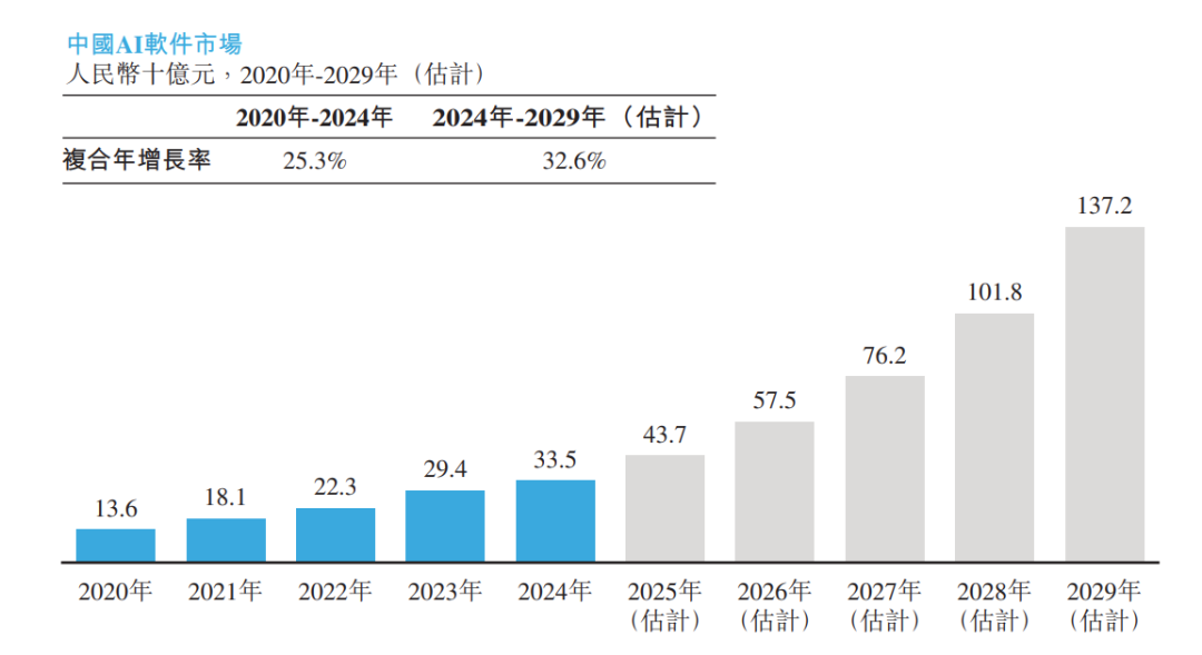 根据弗若斯特沙利文(Frost & Sullivan)报告,AI软件指面向企业设计的软件产品,借助人工智能技术,通过私有部署助力业务流程优化、决策支持、产品创新及运营效率提升。这类软件包括支持数据处理、模型训练与部署的AI基础设施软件,以及针对各类业务场景定制的AI应用软件。AI软件广泛应用于金融、制造、零售、公共部门等多个行业,是企业数智化转型的关键技术支撑。以收入计,中国AI软件市场规模从2020年的人民币136亿元增长至2024年的人民币335亿元,2020年至2024年复合年增长率为25.3%。展望未来,预计到2029年,中国AI软件市场规模(以收入计)将达到人民币1,372亿元,2024年至2029年复合年增长率为32.6%。