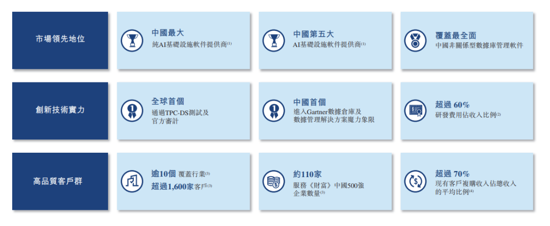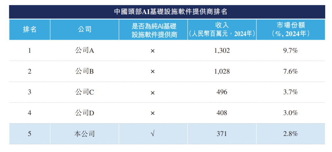 根据弗若斯特沙利文(Frost & Sullivan)报告,AI基础设施软件市场的提供商大致可分为纯AI基础设施软件提供商与非纯AI基础设施软件提供商。纯AI基础设施软件提供商自成立以来就专注于AI基础设施软件,提供针对人工智能驱动型企业独特需求的专业化解决方案。相比之下,非纯AI基础设施软件提供商通常提供更广泛的产品与服务,AI基础设施软件是其庞大产品组合中的一部分。以2024年的收入计,公司是中国第五大AI基础设施软件提供商,市场份额为2.8%,同时也是该市场中最大的纯AI基础设施软件提供商。