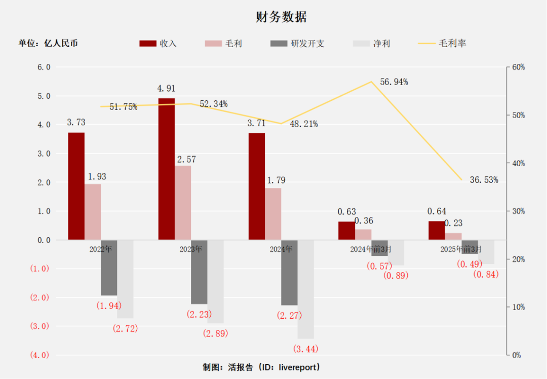这张财务数据图表展示了公司2022 - 2025年前3月的收入、毛利、研发开支、净利及毛利率情况。2022 - 2023年收入从3.73亿增长到4.91亿,毛利从1.93亿增至2.57亿,毛利率在2023年达52.34%,研发开支和净利的亏损也有所扩大;2024年收入回落至3.71亿,毛利降至1.79亿,毛利率降至48.21%,研发开支与净利的亏损态势持续;2024和2025年前3月对比,收入略有增长,但毛利下降明显,毛利率大幅下滑,研发开支与净利的亏损额也均有减少。整体来看,公司在收入、毛利等核心指标上呈现出波动变化,需关注盈利能力的改善及成本控制情况。
