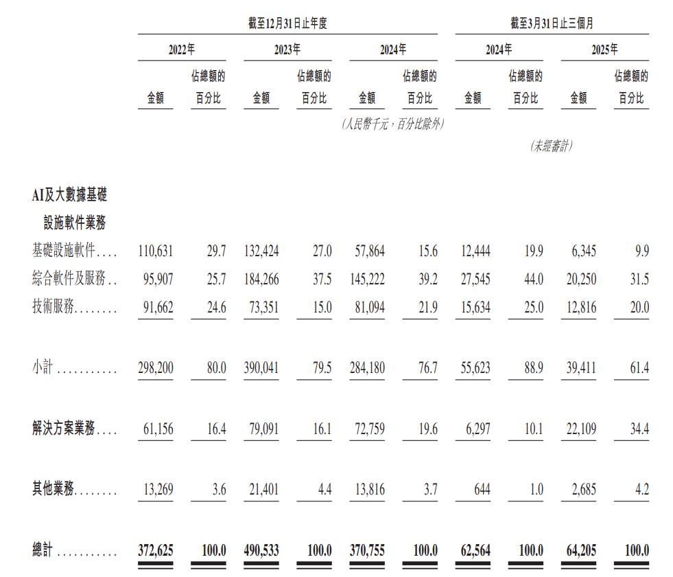 于往绩记录期间,公司产生的收入主要来自:(i)AI及大数据基础设施软件业务;(ii)提供解决方案业务;及(iii)其他业务。