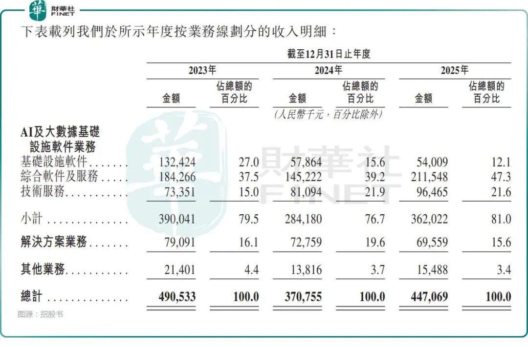 分业务来看,星环科技呈“高毛利主业占比持续提升、低毛利业务收缩”的趋势。2025年,AI与大数据基础设施软件业务实现收入3.62亿元,占总收入比重达81.0%,对应毛利率高达61.7%,成为业绩与利润的核心。