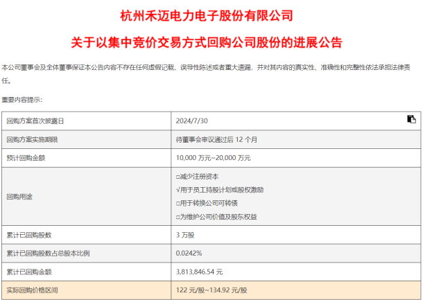 2025年1月3日,禾迈股份发布公告称,董事会已审议通过回购方案,截至2024年12月31日,公司累计回购股份3万股,回购成交价在122元/股—134.92元/股区间,耗资381.4万余元。