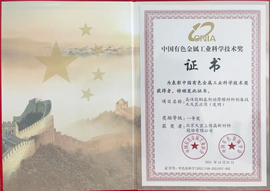 近期,中国有色金属工业协会发布了《关于颁布2021年度中国有色金属工业科学技术奖的通知》,北京天宜上佳高新材料股份有限公司(以下简称“天宜上佳”)与北京科技大学共同攻关的“高性能铜基制动摩擦材料制备技术及其应用(发明)”项目荣获2021年度有色金属工业科学技术奖一等奖。