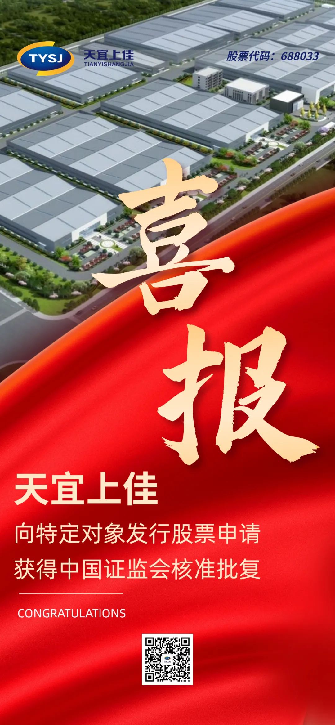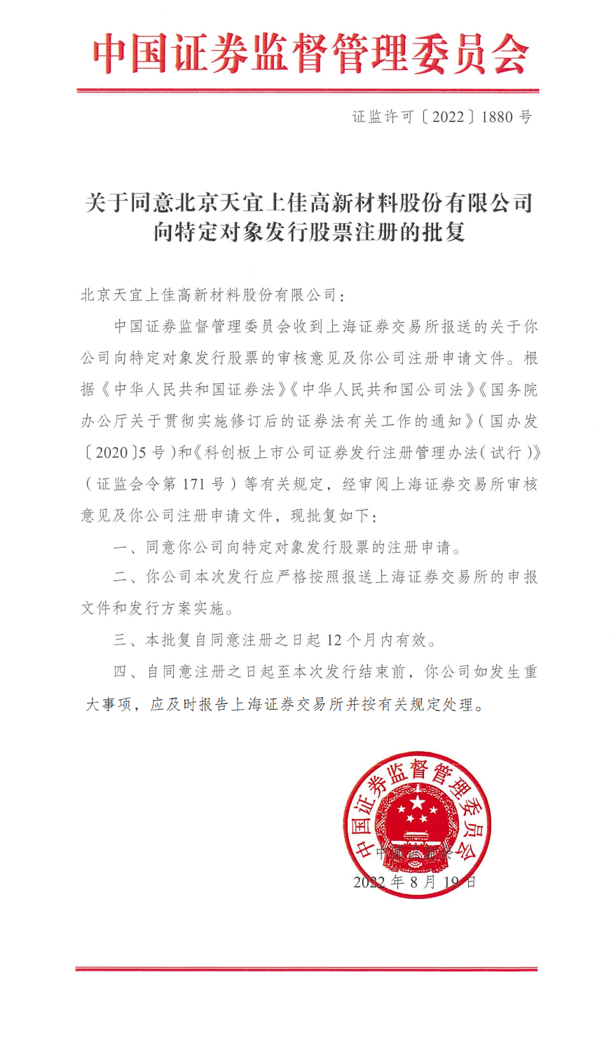 2022年8月30日,天宜上佳收到中国证监会出具的《关于同意北京天宜上佳高新材料股份有限公司向特定对象发行股票注册的批复》,公司定增事项正式获批!