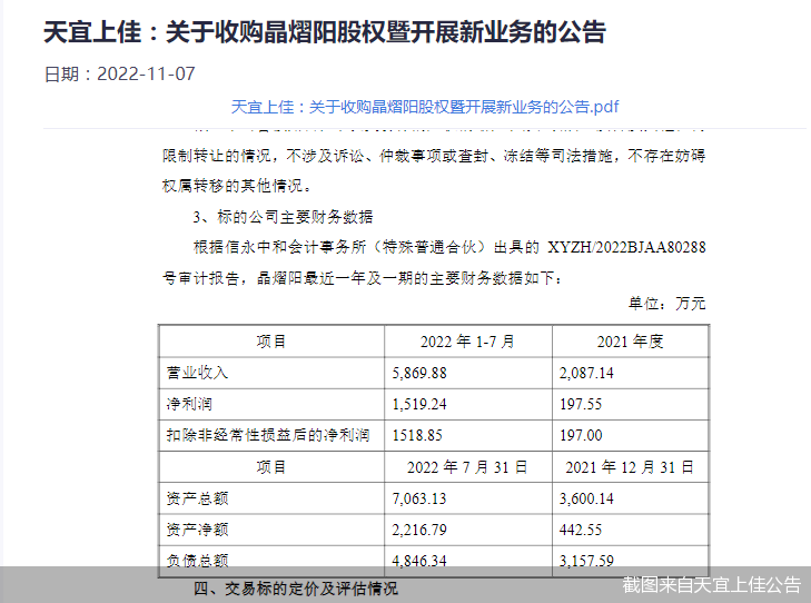 财务数据显示,高溢价收购背后,晶熠阳业绩出现大增,2021年以及2022年1-7月,标的公司实现营业收入分别约为2087.14万元、5869.88万元;对应实现净利润分别约为197.55万元、1519.24万元;对应实现扣非后归属净利润分别约为197万元、1518.85万元。