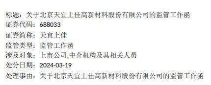 上交所向天宜上佳下发监管工作函,涉及对象为上市公司、中介机构及其相关人员。