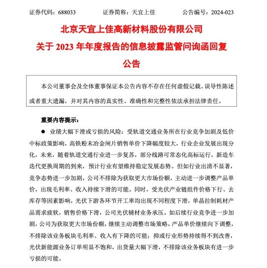 天宜上佳还在公告中提示了业绩大幅下滑或亏损的风险。受轨道交通业务所在行业竞争加剧及低价中标政策影响,高铁粉末冶金闸片销售单价下降幅度较大,行业企业发展出现分化,未来,随着轨道交通行业进一步复苏,部分线路可常态化高标运行,新造车迭代更换周期的到来,预计行业有望维持稳定发展态势。但如行业出清不显著,竞争态势进一步加剧,公司不排除为获取更大市场份额,主动进一步调整产品单价,出现毛利率、收入持续下滑的可能。同时,受光伏产业链组件价格下行、去库存等因素影响,光伏下游各环节开工率均出现不同程度下滑,单晶拉制耗材产品需求疲软,销售价格下滑,公司光伏辅材业务承压。如后续行业竞争进一步加剧,公司为获取更大市场份额,继续主动调整市场策略,产品单价继续向下调整,不排除该业务板块毛利率、收入有下降的可能;抑或行业形势持续得不到改善,光伏新能源业务订单明显不饱和,出货量大幅下滑,不排除该业务板块有进一步亏损的可能。