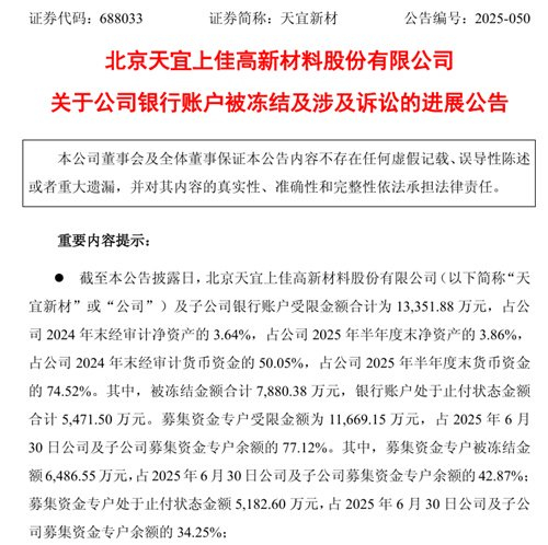 截止9月30日,天宜新材及子公司银行账户受限金额合计为13,351.8万元,占公司2025年半年度末货币资金74.52%。其中,被冻结金额合计7,880.38万元,银行账户处于止付状态金额合计5,471.50万元。