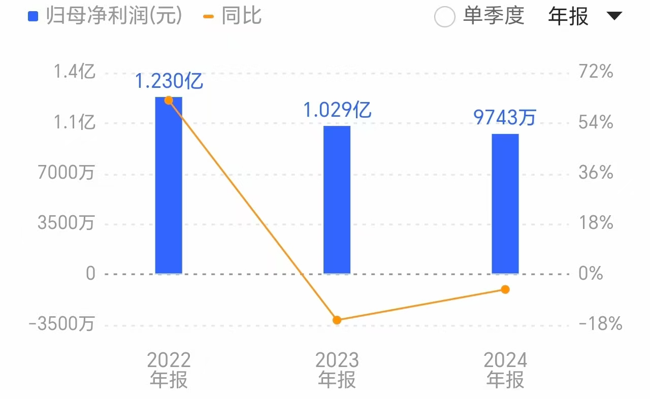 2022年9月,德邦科技在科创板上市,大基金为德邦科技第一大股东,持股18.65%。上市次年,公司业绩就开始走下坡路。2023年和2024年营业收入分别为1.03亿元和9743万元,同比下跌约16.31%和5.36%,2023年二季度至2024年三季度,德邦科技连续六个季度归母净利润下滑。