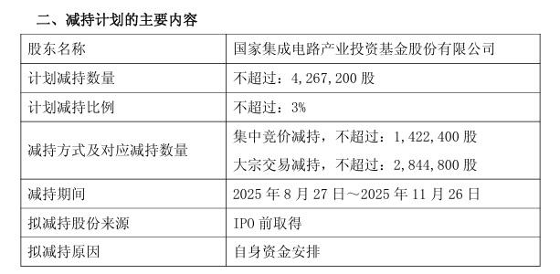 8月5日晚间,德邦科技发布公告称,国家集成电路产业投资基金股份有限公司(下称“国家集成电路基金”)拟通过集中竞价交易方式、大宗交易方式减持其所持有的公司股份数量合计不超过4267200股,即不超过公司总股本的3%,减持时间为2025年8月27日至2025年11月26日。