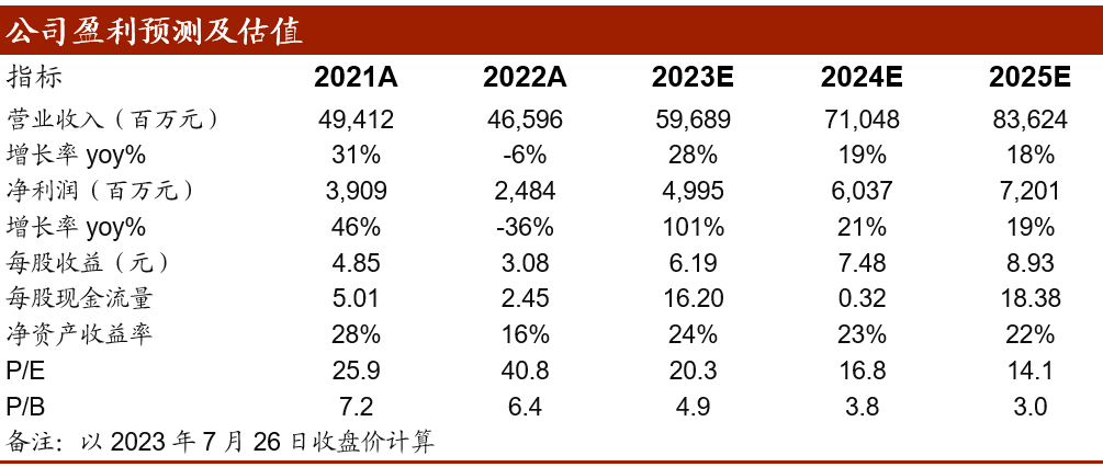考虑到新兴市场手机需求明显复苏,我们上调此前盈利预测,预计公司2023-25年实现归母净利润50/60/72亿元(23-25年对应前值39/50/58亿元),对应PE估值20/17/14倍,维持“买入”评级。