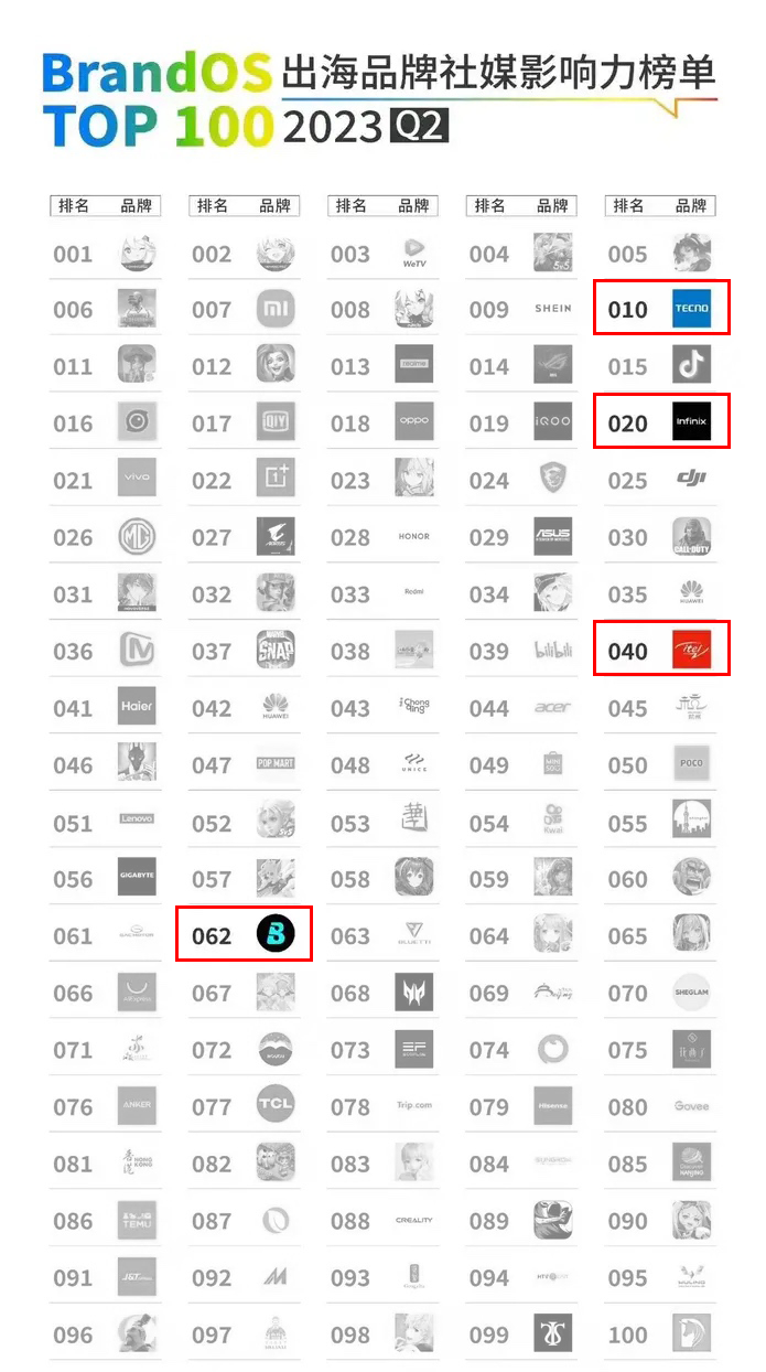 近日,全球社交媒体数据营销管理平台OneSight发布《2023Q2 BrandOS出海品牌社媒影响力榜单》,传音旗下三大手机品牌TECNO、Infinix及itel分别位列第10名、第20名和第40名,非洲音乐流媒体平台Boomplay位列第62名,充分彰显了传音强劲的出海势能和品牌影响力。