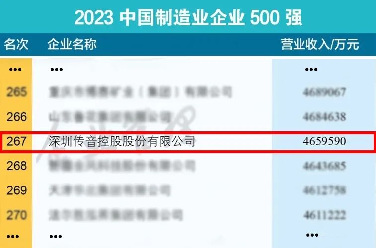 9月20日,在2023中国500强企业高峰论坛上,中国企业联合会、中国企业家协会发布中国企业500强、中国制造业企业500强等各项榜单。传音控股凭借高质量发展水平和创新实力同时入选“2023中国制造业500强”和“2023中国大企业创新100强”双榜,分别位列第267名、第85名。