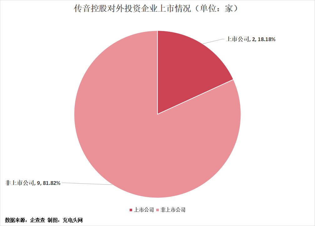 传音控股对外投资的企业中,上市公司2家,分别为思特威(上海)电子科技股份有限公司、深圳市江波龙电子股份有限公司,占比18.18%;非上市公司9家,占比81.82%。