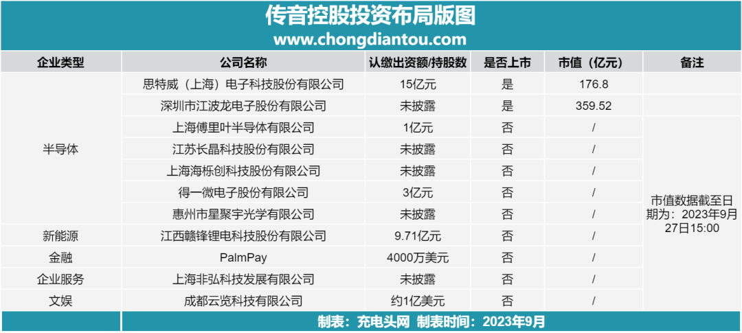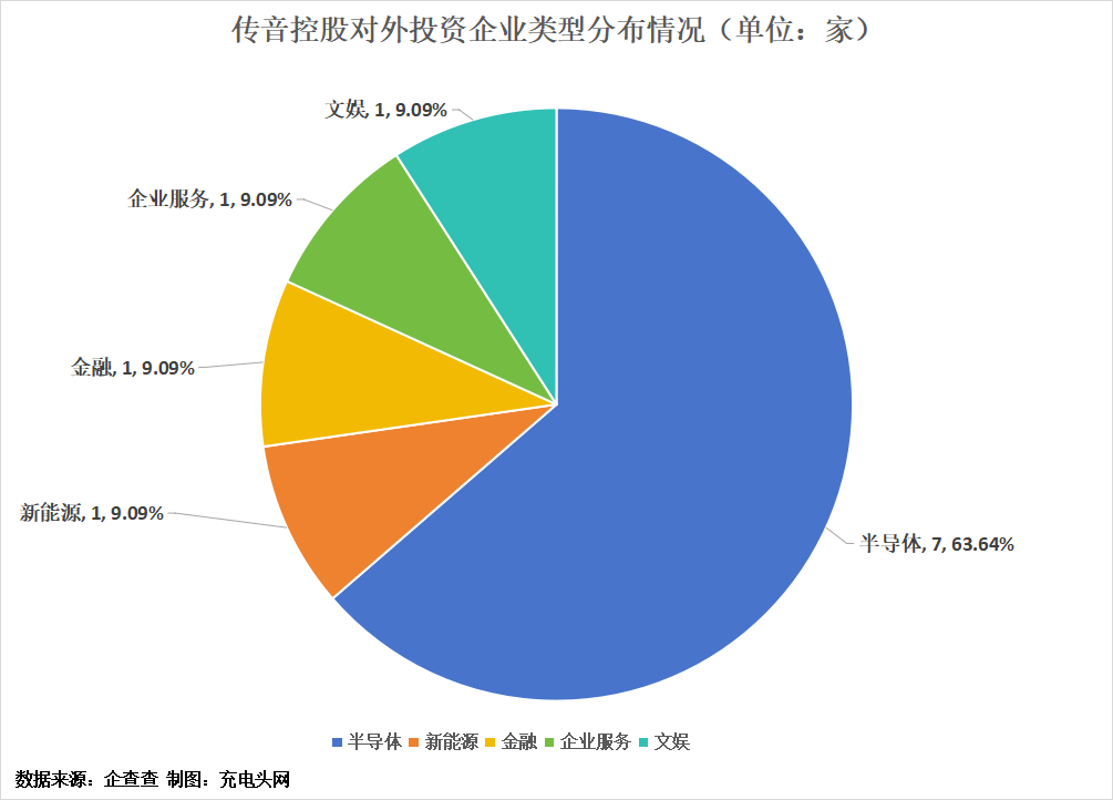 据充电头网了解,传音控股对外投资的这11家企业中,半导体企业有7家,占比63.64%;新能源企业1家,占比9.09%;金融、企业服务、文娱企业各1家,占比都为9.09%。