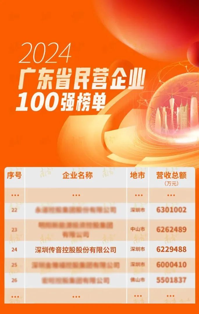 10月29日,广东省工商联正式发布“2024广东省民营企业100强”、“2024广东省制造业民营企业100强”等系列榜单。传音积极拓展新兴市场,深化多元业务布局,企业综合实力和市场竞争力稳步提升,位列“2024广东省民营企业100强”第24名、“2024广东省制造业民营企业100强”第14名,较去年分别前进10名、5名。
