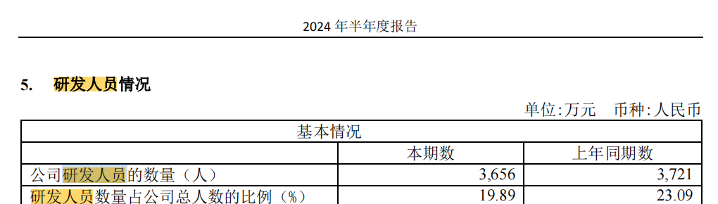 截至今年6月末,传音控股的研发人员数量为3656人,较上年同期下降3.2%。而且公司研发人员数量占公司总人数的比例也由23.09%降至19.89%。
