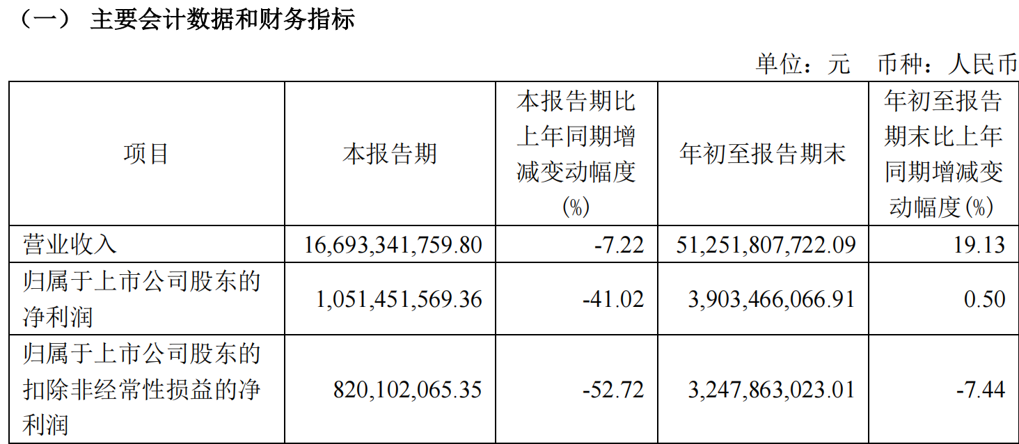 据财报显示,公司前三季度营收512.52亿元,同比上升19.13%;归母净利润39.03亿元,同比上升0.5%;扣非净利润32.48亿元,同比下降7.44%。