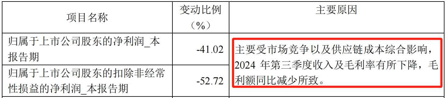 对此,公司在财报中解释称,主要是受市场竞争以及供应链成本综合影响,2024年第三季度收入及毛利率同比有所下降,毛利额同比减少。