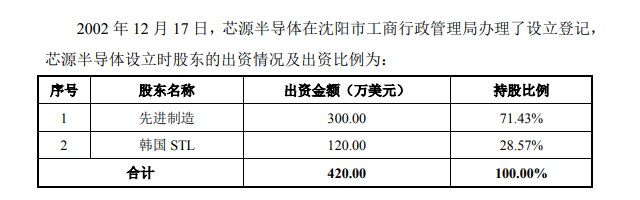 郑广文与芯源微的渊源始于2002年12月1日,先进制造、韩国STL签订《中外合资经营沈阳芯源先进半导体技术有限公司合同》《中外合资经营沈阳芯源先进半导体技术有限公司章程》,约定共同出资设立芯源半导体,投资总额为840万美元,注册资本为420万美元。先进制造出资300万美元,持股比例71.43%,韩国STL出资120万美元,持股比例28.57%。