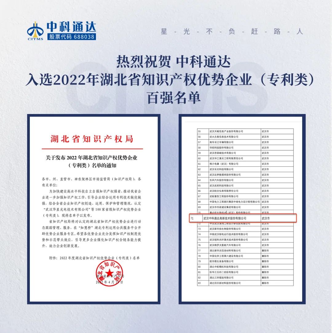 热烈祝贺中科通达入选2022年湖北省知识产权优势企业(专利类)百强名单