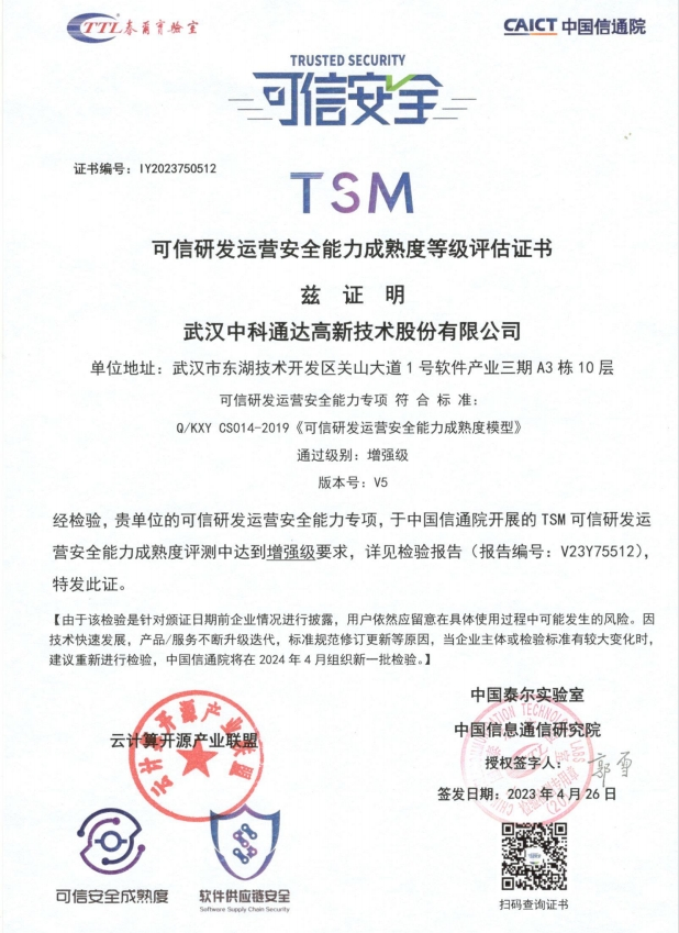中科通达近日正式通过中国信通院“TSM可信研发运营安全能力成熟度”增强级认证,在诸多参与认证的企业中,成为华中地区首家通过认证的软件工程可信企业。