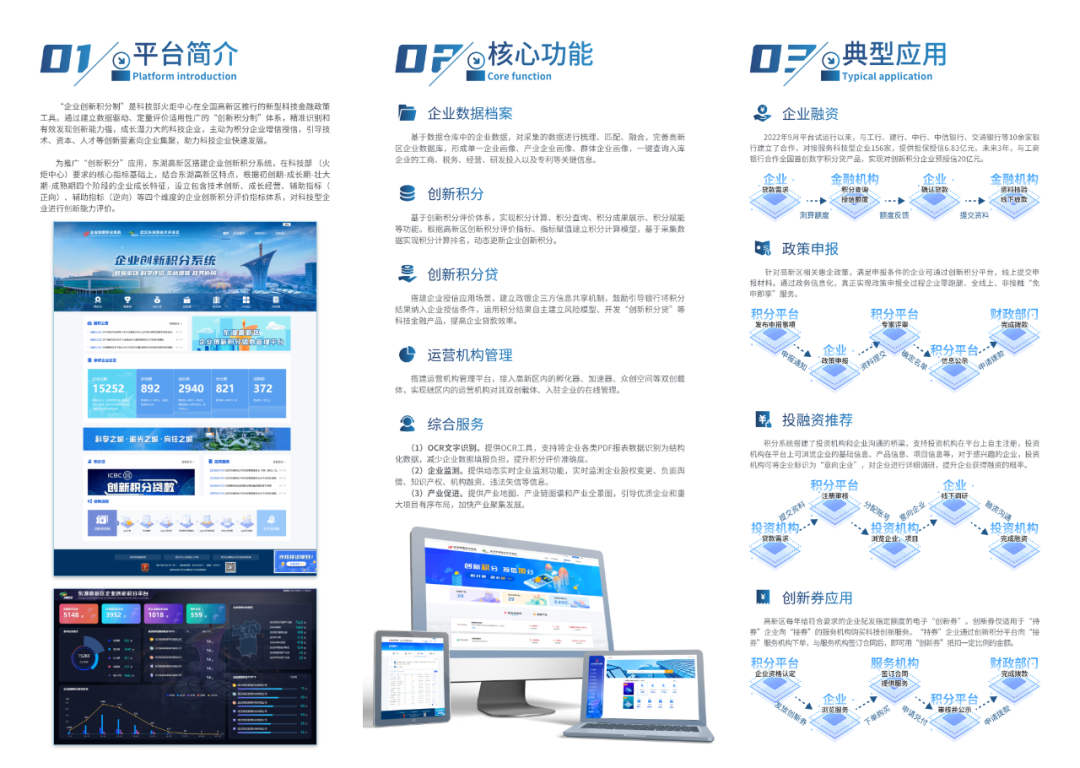 “东湖高新区企业创新积分系统”以“企业创新积分制”为核心,围绕企业的工商、税务、营收等各类数据进行全量的汇聚,通过客观的评价指标体系对参评企业的创新能力量化评分,精准识别和有效发现创新能力强、成长潜力大的科技企业。“积分系统”接入多种典型应用场景,能充分满足政府用户、企业用户、金融机构、服务机构等多种用户不同业务场景的实际需求,已逐步发展为政务服务的综合应用平台,实现“一个积分,多种应用”。