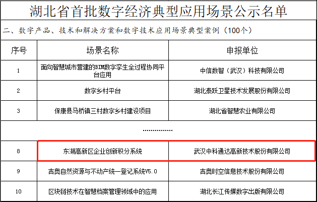 2023年7月6日,湖北省发展和改革委员会发布《关于湖北省首批数字经济典型应用场景的公示》,由中科通达自主研发并实施交付的“东湖高新区企业创新积分系统”成功入选。