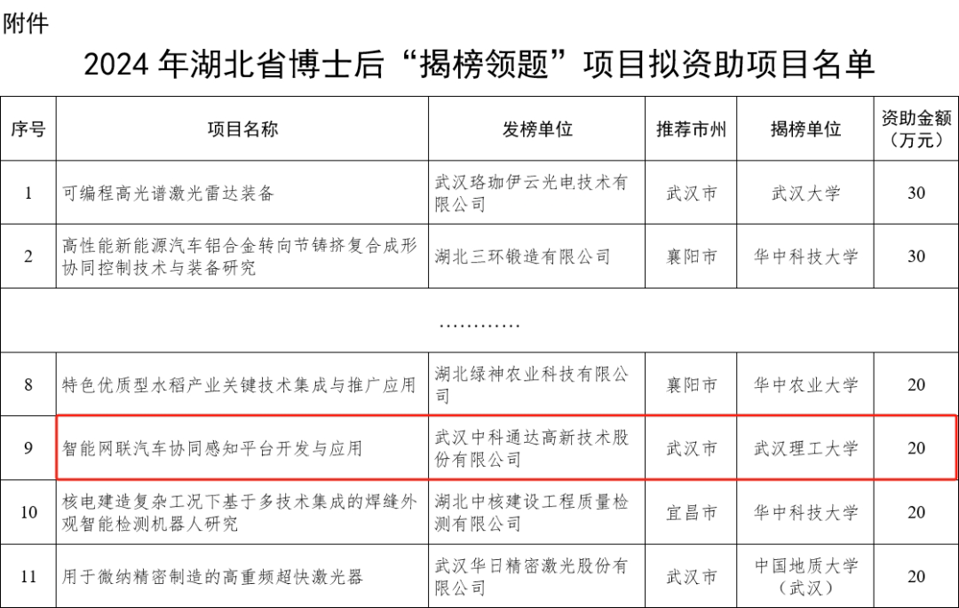 近日,湖北省人力资源和社会保障厅公示2024年湖北省博士后“揭榜领题”拟资助项目,中科通达发榜、武汉理工大学揭榜的“智能网联汽车协同感知平台开发与应用”项目成功入选。