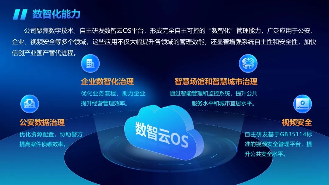 公司产品和技术深度融合国家信创产业发展战略,以物联感知服务、视频图像处理、大数据能力为基础,在物联感知、大数据处理、底座服务、视频图像综合应用、情指勤舆一体化、智慧交通、智慧小区、基础警务等数字城市及公安信息化领域为客户提供专业的解决方案、平台产品、技术服务。