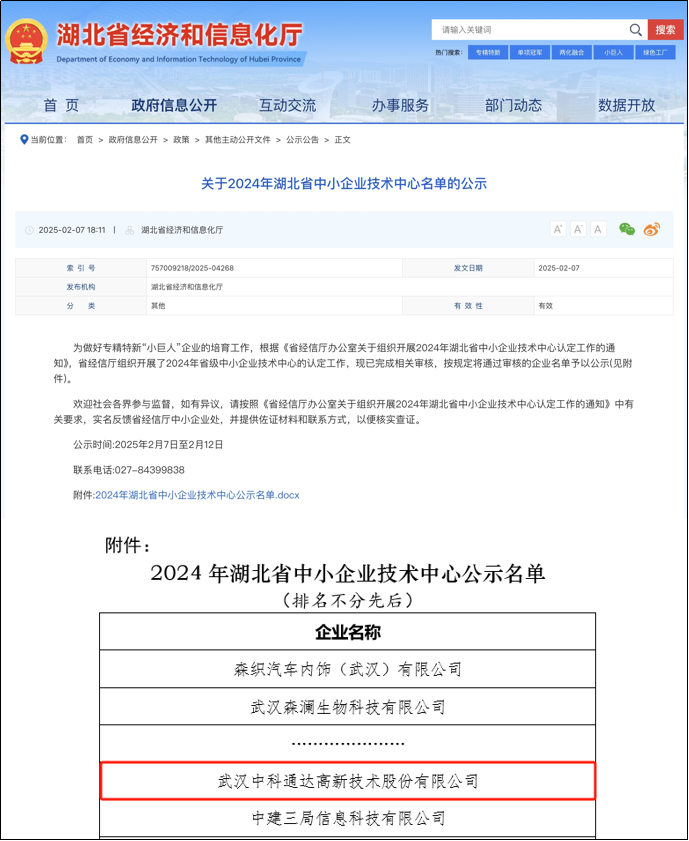 2025年2月7日,湖北省经济和信息化厅正式公示“2024年湖北省中小企业技术中心”名单。经过企业申报、专家评审和现场审核,中科通达凭借卓越的技术实力、持续的创新能力以及在公共安全和数字社会治理领域的深厚积累,成功获评“湖北省中小企业技术中心”。