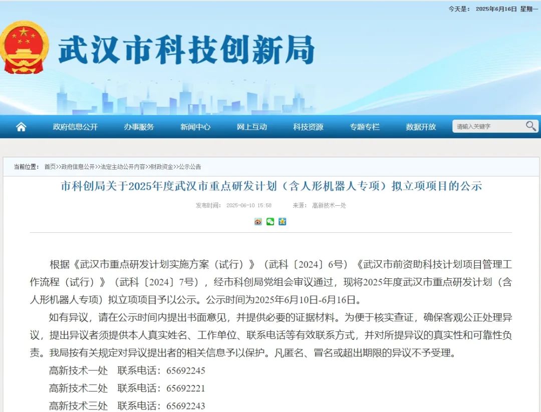 市科创局关于2025年度武汉市重点研发计划(含人形机器人专项)拟立项项目的公示