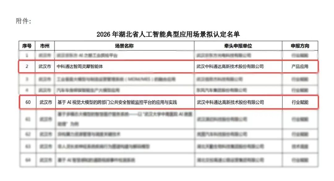 近日,省经信厅公示关于2026年湖北省人工智能典型应用场景拟认定名单,经企业自主申报、各市州推荐、专家评审、会议研究等程序,“中科通达智周灵犀智能体”、“基于AI视觉大模型的跨部门公共安全智能监控平台的应用与实践”等2个场景同时入选2026年湖北省人工智能典型应用场景。