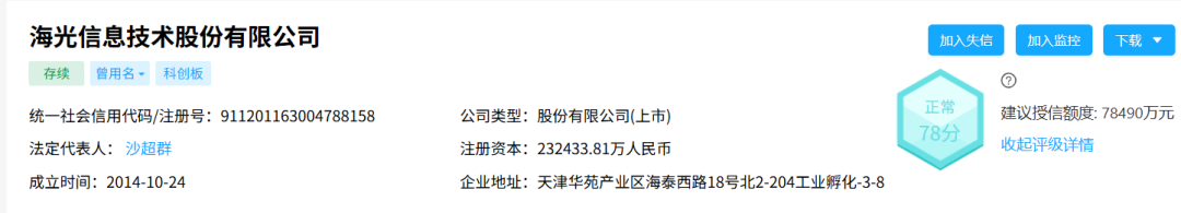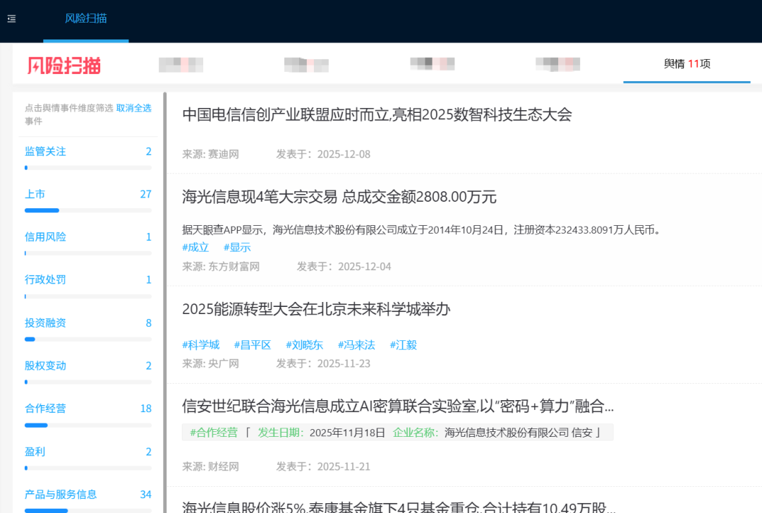 根据AI风险控制系统“RiskRaider风险雷达”的风控监控数据,观测AI对 海光信息 的风险信息,部分截图如下: