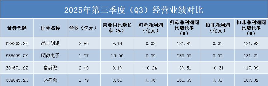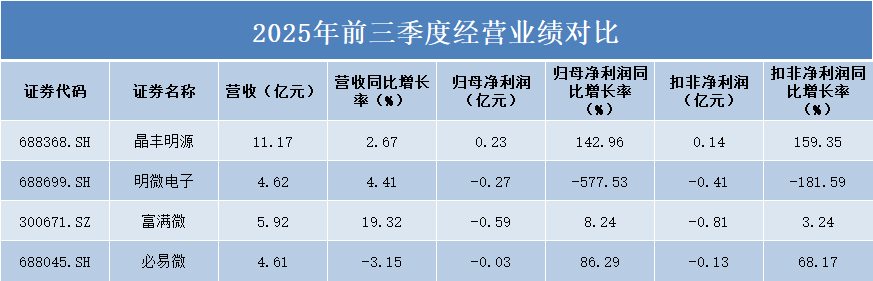 从2025年前三季度营收规模来看,晶丰明源以11.17亿元位居首位,富满微、明微电子和必易微分别为5.92亿元、4.62亿元和4.61亿元。
