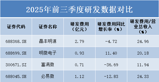 从研发费用总额来看,晶丰明源以2.79亿元的投入规模位居首位,必易微、明微电子和富满微分别为1.12亿元、0.93亿元和0.71亿元。