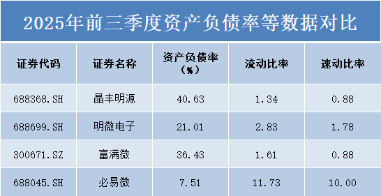 从资产负债率来看,四家公司呈现出不同的财务策略。必易微的资产负债率仅为7.51%,显示出极度保守的财务政策,公司主要依靠自有资金运营,财务风险极低。