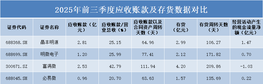 从应收账款规模看,晶丰明源以2.81亿元居首,富满微为2.53亿元,明微电子和必易微分别为1.20亿元和0.96亿元。