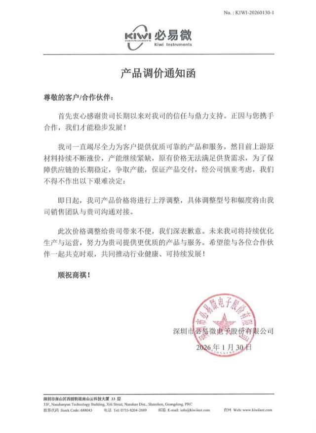 1 月 30 日,国内模拟及数模混合集成电路设计企业必易微发布产品调价通知,成为 2026 年半导体涨价潮中的又一跟进企业。受上游原材料持续涨价、产能紧缺影响,为保障供应链稳定与产品交付,必易微公司即日起上调全系列产品价格,具体型号及涨幅由销售团队与客户一对一沟通。必易微对调价带来的不便致歉,并表示将持续优化生产运营,与合作伙伴共克时艰。