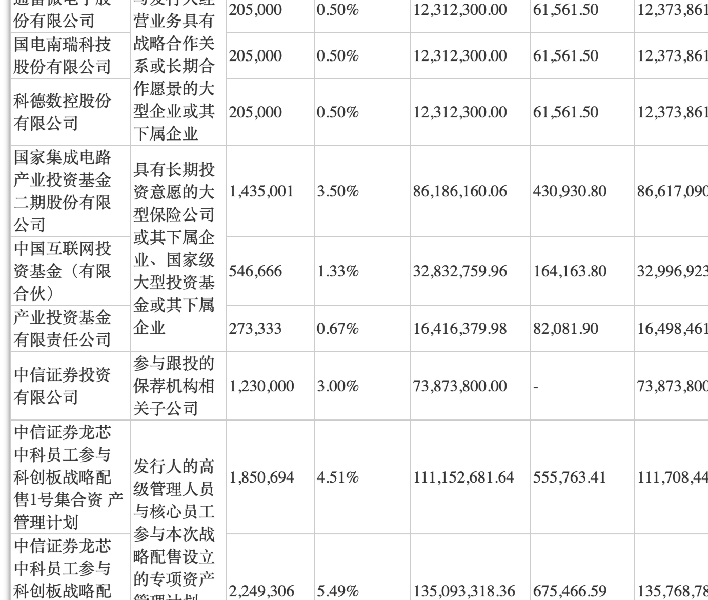 虽然在机构中碰了壁,但龙芯中科的战略配售团队十分“闪耀”。通富微电(002156.SZ)、国电南瑞(600406.SH)、科德数控(688305.SH)三家上市公司均参与了战略投资。此外,备受关注的国家集成电路产业投资基金二期也对龙芯中科“青睐有加”,获配比例为3.5%,是继发行人高管与核心员工的专项配售计划之外,占比最高的战略投资者。